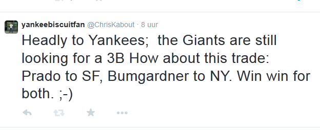 The Detroit TIgers’ third baseman Nick Castellanos’ defensive numbers are similar to those of Martin Prado. But Prado is a much better hitter. David Price would would be a nice price. If the Yanks would trade for Price the must hammer out a deal this season, since Price is in the final season of his contract. But I think this will never happen. First of all the TIgers will ask a lot in return. And second of all, you can count on the fact that he will file for free agency and the Tigers will make a qualifying offer to get a draft pick in return.