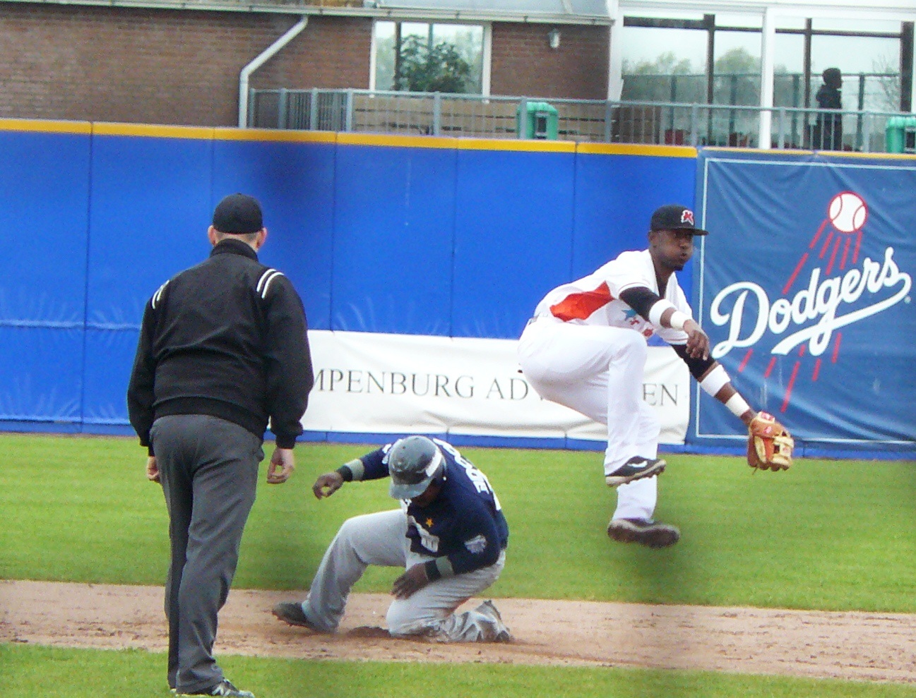An example of the uninspired Kinheim came in the second inning when Urvin Kemp occupied first base when Rien Vernooij grounded into what should have been a double play. But Kinheim’s first baseman Jeffrey Arends threw the ball against the back of Urvin Kemp to blow the double play, so both runners were safe. The other example came in the top of the seventh. With Scott Ronnenbergh on the mound, and with Benjamin Dille on third and Raily Legito on first, Legito tried to steal