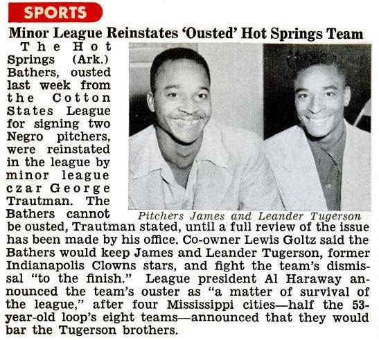 At the time they signed the players, in 1953, the Bathers were dead last in the league, so the signing of the Tugerson brothers (Jim and Leander) was an act of self-interest for sure. First, most of the other teams in the league did not really care about the attempt of the Bathers to integrate the league, but the Mississippi based teams wanted to expel the Bathers from the circuit. That sentiment got stronger among the league’s directors, so the the Bathers offered to use the Tugerson brothers only in Arkansas and Louisiana, but that offer was rejected. The league president, Al Haraway mentioned the signing of the Tugerson brothers by Hot Springs, an act of treason. Mississippi’s attorney general, J. P. Coleman, insisted that racially