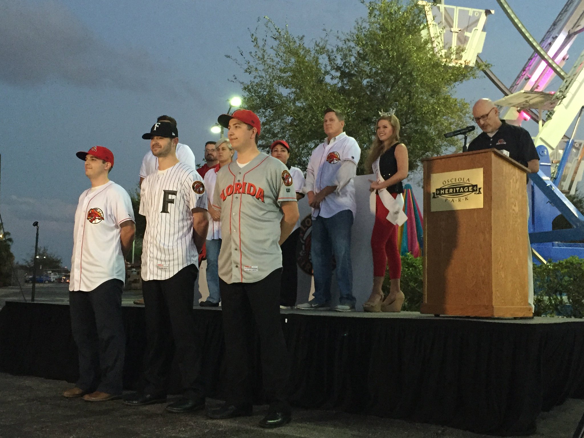 The uniforms were unveiled at the Osceola county fair. The team will sport three uniforms: an all white home uni, a gray road uni and an alternate uni with pinstripes.