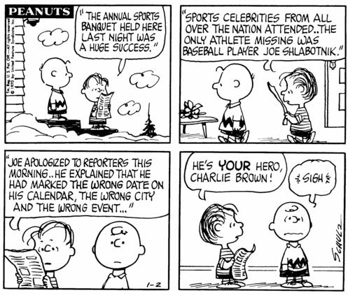 Joe Shlabotnik is still feeling honored for being mentioned in the comic “Peanuts.” As Joe admitted he is quite messy at times, this explains why he did not show up at a testimonial dinner and a sports banquet where Charlie Brown would be as well. In the first case he lost his way at a car wash and in the second case, he marked the wrong date and wrong event at his calendar. As a result, Charlie Brown never managed to meet his hero.