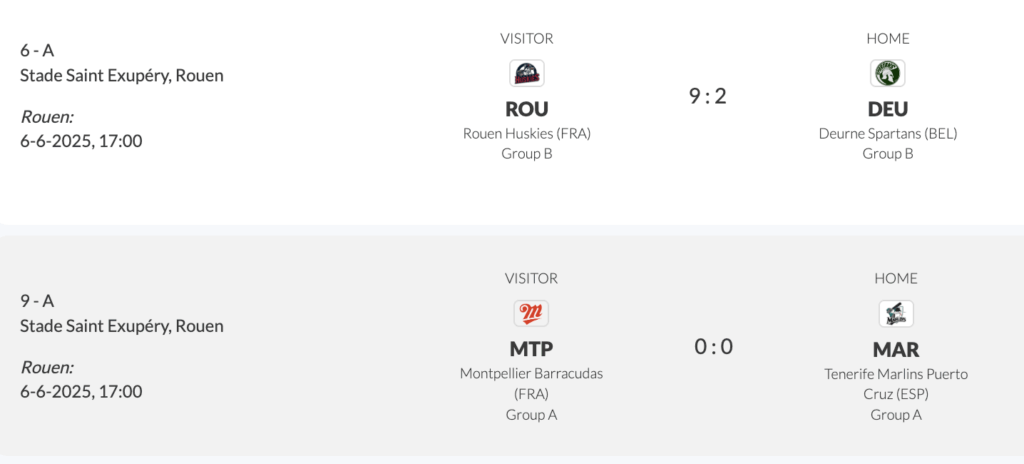As you can see, the game between the Montpellier Barracudas and the Tenerife Marlins is scheduled at exactly the same time. As the Rouen Huskies have only one field, the game between the fishes will likely be pushed back. As the club does not have a lighting installation, there is a chance that that game has to be suspended due to darkness.