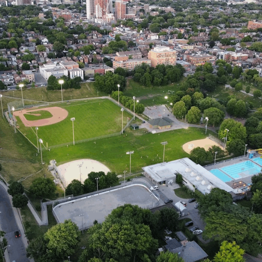 The ballpark is located at the lush surroundings of Christie Pits Park, which was named after the Christie Sand Pits which were on the location until the early 1900s. The sand pits had been named after Christie Street, which was named after Christy MacDougall, wife of Peter MacDougall, a landowner in the area.