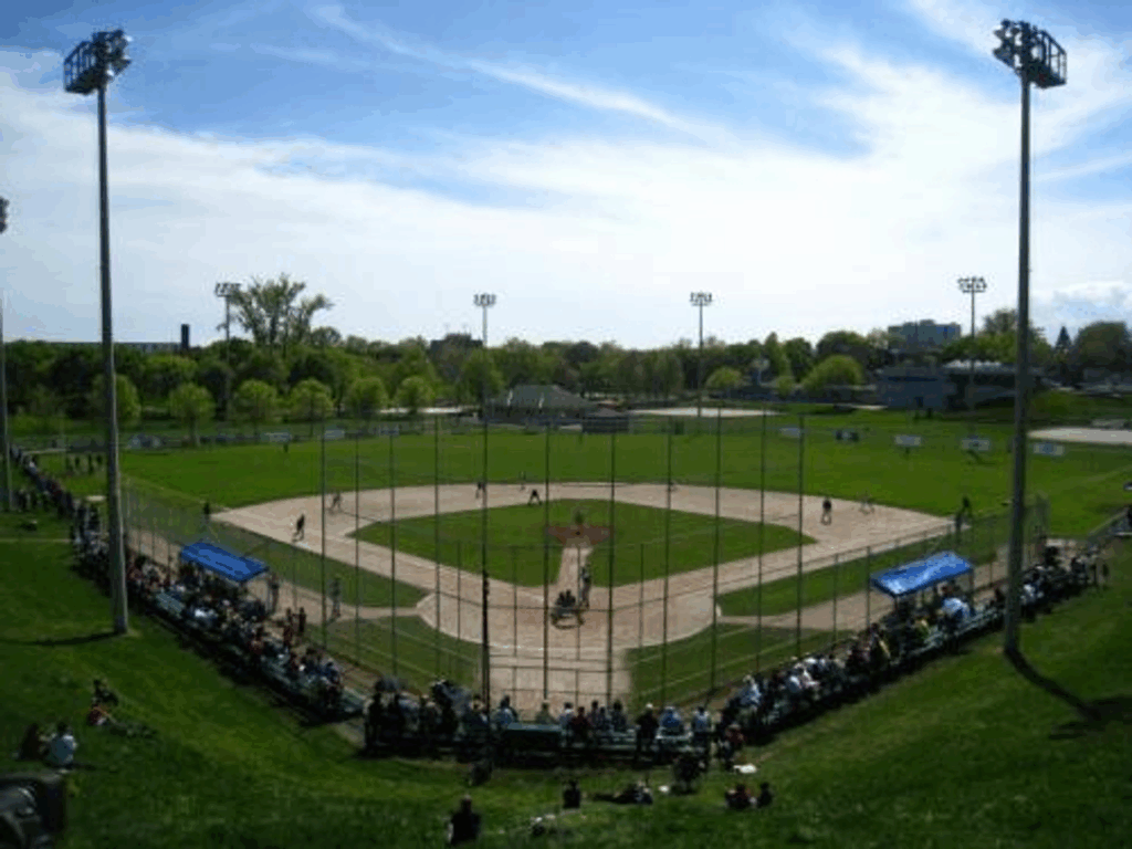 The ballpark is located in a pit, down surrounding streets. The small bleachers offer a limited seating capacity. Most spectators prefer to sit on the grass berms that surround the diamond.
