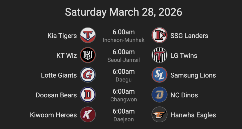 The 2026 KBO season will start tomorrow, March 28. The schedule looks like this: